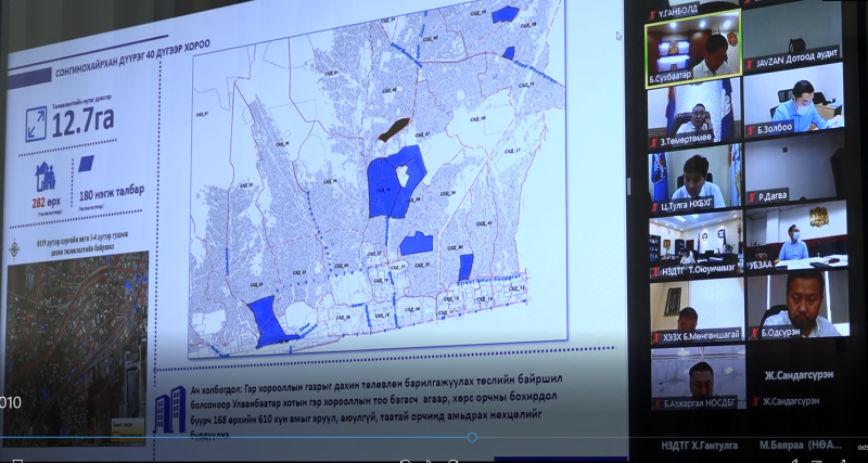Зөвлөлийн хурлаар Гэр хорооллын газрыг дахин төлөвлөн, барилгажуулах төсөл хэрэгжүүлэх байршил, хэмжээ, хил зааг, зориулалт тогтоох тухай асуудлыг Нийслэлийн Хот байгуулалтын асуудал хариуцсан төслүүдийн удирдагч Б.Сүхбаатар танилцуулав. Сонгинохайрхан дүүргийн 40 дүгээр хороо нь 2548 өрхийн 9009 хүн амтай. Нутаг дэвсгэрийн хэмжээ 2.200 га бөгөөд зүүн талаараа Сонгинохайрхан дүүргийн 7, 8 дугаар хороо, баруун талаараа 41 дүгээр хороо, хойд талаараа 9 дүгээр хороотой хиллэдэг. 40 дүгээр хорооны Хилийн цэргийн 0119-ийн 1-4 дүгээр гудамжны 144 иргэнээс гэр хорооллын газрыг дахин төлөвлөн барилгажуулах төслийн байршилд хамрагдах хүсэлтээ ирүүлсэн. Дээрх байршилд 12.7 га, 180 нэгж талбар хамрагдаж байна. Иргэдээс ирсэн хүсэлтийг үндэслэн, Гэр хорооллын газрыг дахин төлөвлөн, барилгажуулах төсөл хэрэгжүүлэх байршил, хэмжээ, хил зааг, зориулалт тогтоох асуудлыг НИТХ-ын Тэргүүлэгчдийн хуралдаанаар хэлэлцүүлж, шийдвэрлүүлэхээр болов.