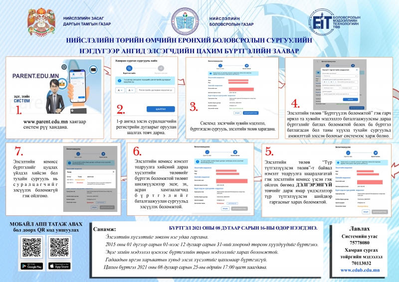 Боловсрол, шинжлэх ухааны яам, Улсын бүртгэлийн ерөнхий газартай хамтран нэгдүгээр ангид элсэх зургаан настай хүүхдүүдийг гэрийн хаягийн дагуу хамран сургах тойргийн сургуульд нь бүртгэхээр болсон. Тухайн сургуульд суралцах сурагчдын нэрсийн дагуу эцэг, эхчүүд бүртгэлийг www.parent.edu.mn цахим хуудсаар баталгаажуулах учиртай. Бүртгүүлэх явц амар хялбар, системийн хувьд саатал, хүндрэлгүй байгаа хэдий ч эцэг, эхчүүд хүүхдүүдээ бүртгүүлэхгүй, бүртгэлийн явц удаашралтай байна. Иймд эцэг, эхчүүдийг бүртгэлдээ идэвхтэй хамрагдахыг Нийслэлийн Боловсролын газраас уриаллаа.