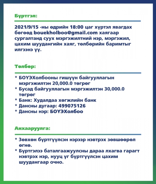 Байгаль орчин, аялал жуулчлалын сайдын 2021 оны А/66 дугаар тушаалын дагуу "Байгаль орчны нөлөөллийн нарийвчилсан үнэлгээ хийх эрх бүхий мэргэжлийн байгууллагын мэргэжилтнүүдийг чадавхжуулах" сургалтыг зохион байгуулах ажлын хүрээнд хийгдэж буй цахим сургалтад идэвхтэй хамрагдахыг хүсье.