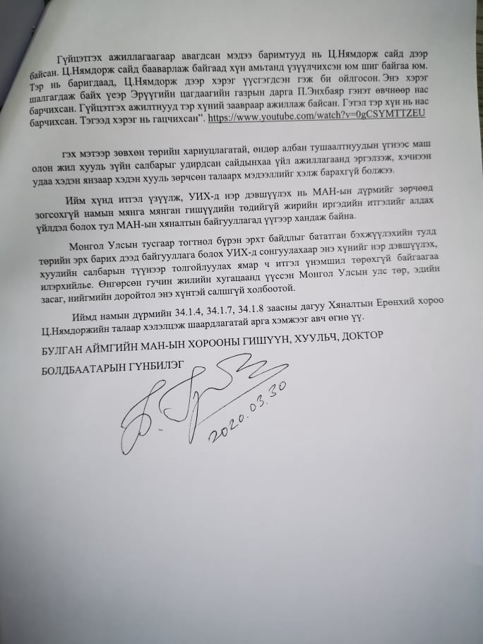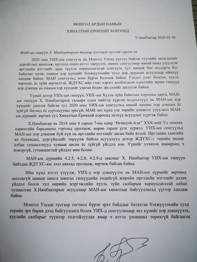 Тэрээр өргөдөлдөө "Х.Нямбаатар нь 2018 оны 6 сарын 7-нд Өгөөдэй Ази компанийн Үл хөдлөх хөрөнгийн барьцааны гарын гэрээнд оролцож, өөрийн гарын үсгээ зуржээ. УИХ-ын сонгуульд МАН-аас нэр дэвшиж буй хүн нь иргэдийн итгэлийг авсан байх ёстой. МАН-ын дүрэмд заасныг Х.Нямбаатар УИХ-ын гишүүн байхдаа ЖДҮХС-аас зээл авахад оролцож зөрчиж байсан байна. Намын дүрэмд заасны дагуу ХЕХ Х.Нямбаатарын талаар хэлэлцэж, шаардлагатай арга хэмжээ авч өгнө үү" гэжээ.