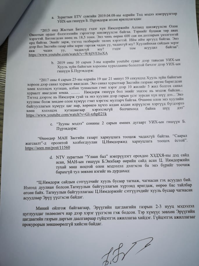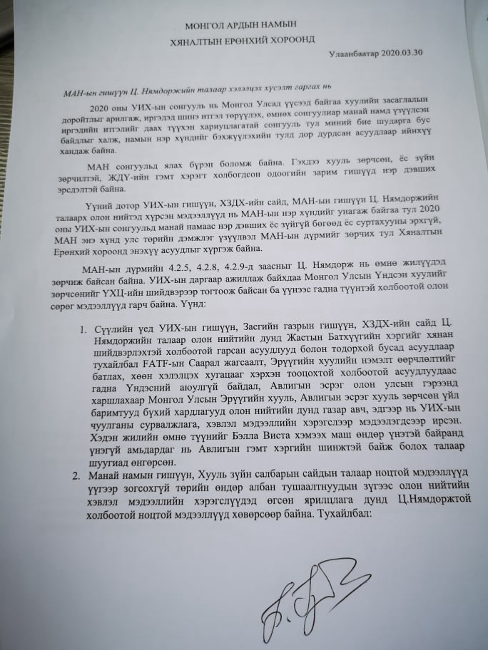 Мөн "Хууль зүй, дотоод хэргийн сайд Ц.Нямдоржийн талаар хүрсэн мэдээллүүд нь МАН-ын нэр хүндийг унагаж байгаа тул УИХ-ын сонгуульд манай намаас нэр дэвших ёс зүйгүй бөгөөд ёс суртахууны эрхгүй. МАН энэ хүнд улс төрийн дэмжлэг үзүүлбэл МАН-ын дүрмийг зөрчих тул Хяналтын ерөнхий хороонд энэхүү асуудлыг хүргэж байна" гэсэн байна. Тэрээр өргөдөлдөө Жастын Батхүү, FATF-ийн саарал жагсаалт, хөөн хэлэлцэх хугацаа, сэтгүүлчдийг тагнасан гэх асуудал зэргийг дурджээ.