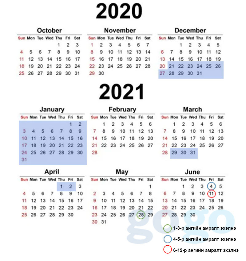 I УЛИРАЛ- 1-12 дугаар анги 16 долоо хоног хичээллэж, 2020.12.21- 2021.01.31-нийг хүртэл амарч, хоёрдугаар сарын 1-нд хичээл орно.