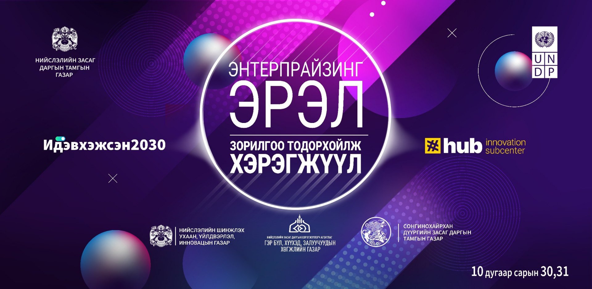 Улаанбаатар хотын алслагдсан дүүрэг, хороодод амьдардаг, ажил хөдөлмөр эрхлэх, ур чадвараа ахиулах, бизнес санаагаа ажил хэрэг болгох зорилго, хүсэл эрмэлзэлтэй 18-35 насны залуусыг хамруулсан "Идэвхэжсэн 2030: Энтерпрайзинг эрэл-зорилгоо тодорхойлж хэрэгжүүл" сэдэвт сургалт, лекц, воркшоп, ажлын байрны мэдээллийн өдөрлөгийг анх удаа жишиг болгон зохион байгуулах гэж байна. Сургалт, өдөрлөг маргааш болно.