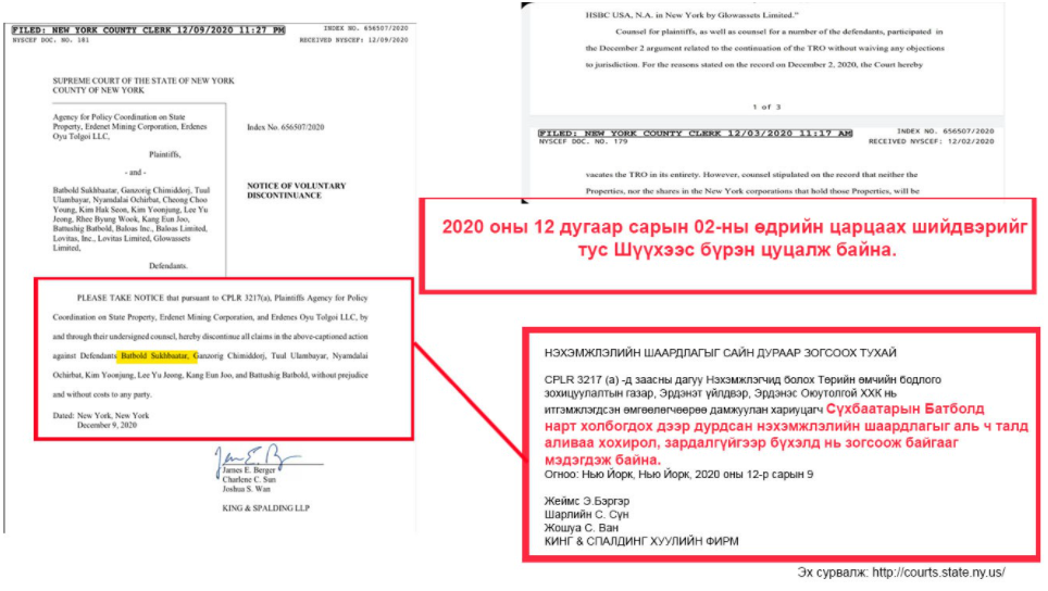 -Нью Йоркийн шүүхэд миний эсрэг гаргасан нэхэмжлэлээ татсан байна. Өөрөөр хэлбэл, надтай холбогдсон асуудал Нью-Йоркийн шүүхэд байхгүй болж байна гэж ойлгосон. Эндээс маш их сонирхол татаж буй зүйл болох гадны ашгийн төлөө хувийн байгууллагад Монголын татвар төлөгчдийн мөнгөнөөс төлж гэрээ хийн мөрдөж тагнах ажиллагаа захиалсан явдлыг хуулийн дагуу шалгуулах нь зүй ёсны хэрэг гэж бодож байна. Энэ асуудлыг би заавал шалгуулах болно.