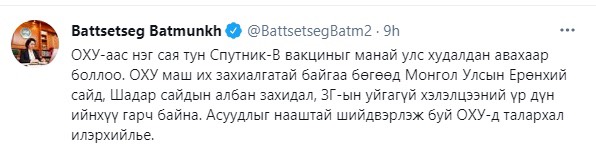 Манай улс ОХУ-аас нэг сая тун Спутник-V вакцин худалдан авахаар болжээ. Энэ талаар Гадаад харилцааны сайд Б.Батцэцэг өөрийн хаарцахим хуудаснаа“ОХУ-аас худалдан авахаар хэлэлцээний түвшинд яригдаж байгаа нэг сая тун Спутник-V вакциныг манай улс авахаар боллоо.