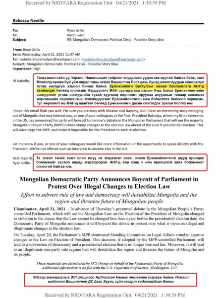 Америкт төвтэй “DCI” гэх лобби фирмийн ажилтан Райн Грилло өөрийн илгээсэн и-мейлдээ “Манай фирмийн хамтран ажиллагч Ерөнхийлөгч Баттулга” гэж бичсэн нь анхаарал татаж байна. Улмаар Үндсэн хуулийн цэцийн шийдвэрийг УИХ-аар хэлэлцсэн үйл явдлыг Ерөнхийлөгчийн сонгуулийн тухай хуулийг өөрчлөх гэж байна гэсэн худал, ташаа мэдээллийг гадны сэтгүүлчид илгээжээ. Түүнчлэн худал мэдээлэл өгөөд зогсохгүй Ерөнхийлөгчтэй шууд холбогдож ярилцах боломжийг санал болгосон нь энэ лобби фирм Х.Баттулгатай маш итгэлтэй, дотно харилцаж байгааг харуулж байгаа юм.