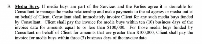Үүнд хэвлэл, мэдээллээр өөрсдийн хүссэн мэдээллийг гаргах харилцааг тус фирм Захиалагчийг бүрэн төлөөлөн хийх бөгөөд 100 мянган доллар хүртэлх төлбөрийг 10 хоногийн дотор шилжүүлэх шаардлагатай гэжээ. Мөн 100 мянган доллараас дээшхи үнийн дүнтэй хэвлэл, мэдээллийн зардлыг гурав хоногийн дотор шилжүүлнэ гэж заасан байгаа нь асар өндөр төлбөрийг, түргэн шуурхай гаргаж өгч байхаар зөвшөөрчээ. Ийнхүү төлбөрөө төлж олон улсын хэвлэлээр “хүссэн дуугаа захиалан” улс, эх орноо зориудаар муухай харагдуулах үйл ажиллагаагаа гэрээгээр албажуулсан байна.